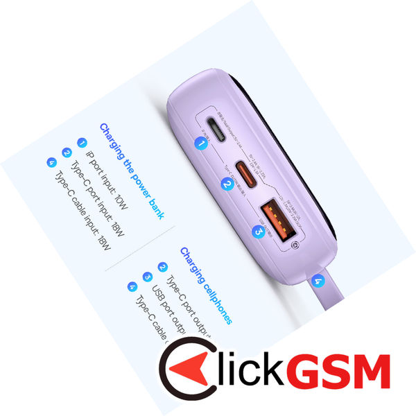 La ClickGSM găsești accesorii dedicate pentru Baseus - Power Bank Qpow Pro+ (P10067101513-00) - Lightning, 2x Type-C, USB, 22.5W, 10000mAh, Cable Type-C - Purple (Portabila), cu garanție de calitate și livrare rapidă pentru modelul Universal.