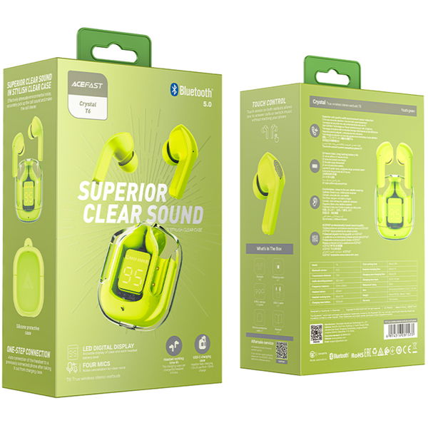 Acefast - Wireless Earbuds (T6) - USB-C, IPX4, Bluetooth 5.3, ENC, Fast Charging, LED Digital Display, 500mAh - Youth Green Universal