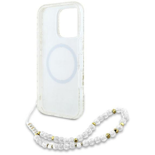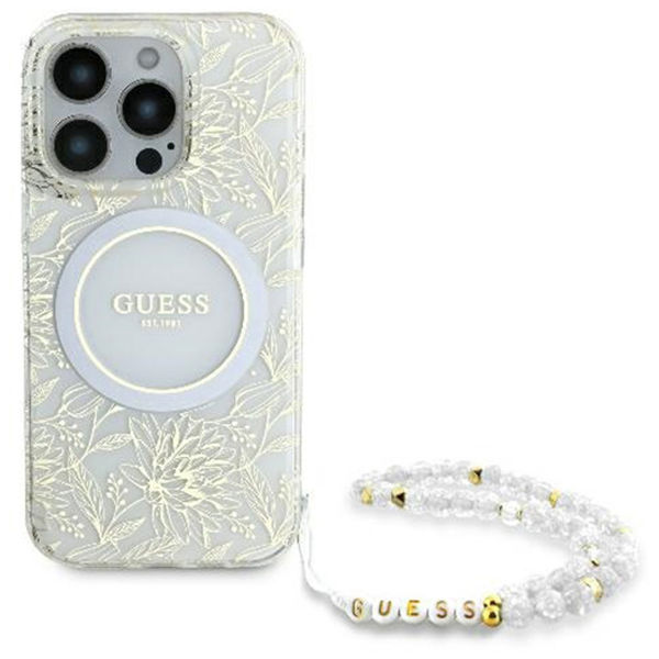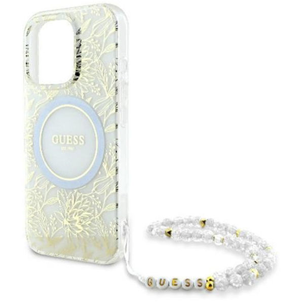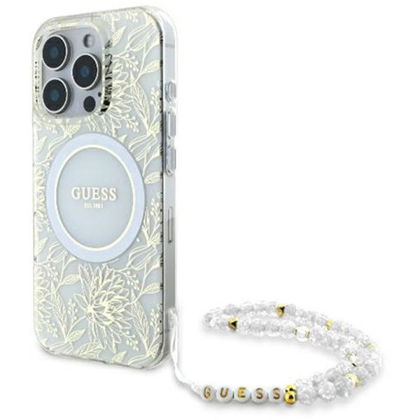 Accesoriu Guess - IML Flowers Allover Electro With Pearl Strap MagSafe (GUHMP16XHCPOFPH) - iPhone 16 Pro Max - White pentru Apple iPhone 16 Pro Max