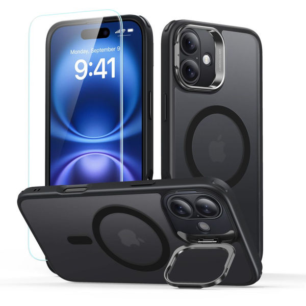 ESR - Classic Hybrid HaloLock Kickstand + Tempered Glass - iPhone 16 - Frosted Black Apple iPhone 16