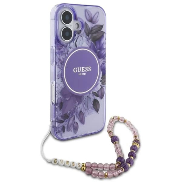 Guess - IML Flowers with Pearl Strap MagSafe (GUHMP16SHFWBRCESU) - iPhone 16 - Purple Apple iPhone 16