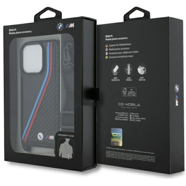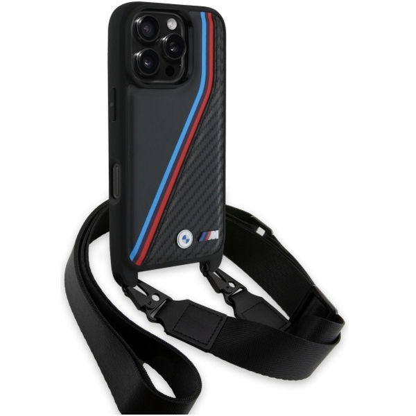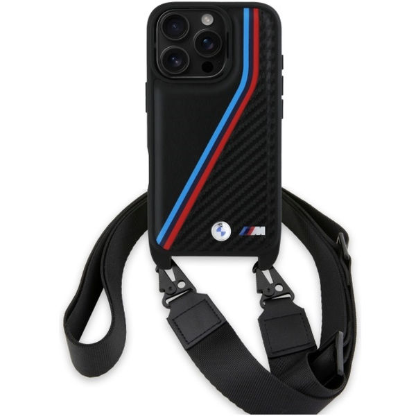 Accesoriu BMW - Leather M Edition Carbon Tricolor Lines & Strap (BMHCP16X23PSVTK) - iPhone 16 Pro Max - Black pentru Apple iPhone 16 Pro Max