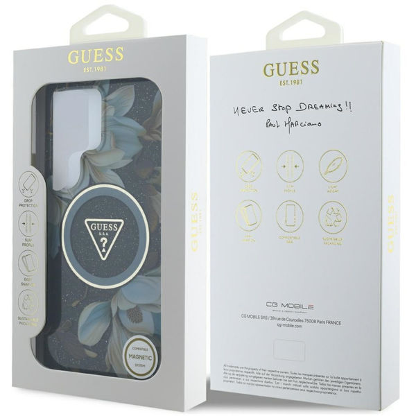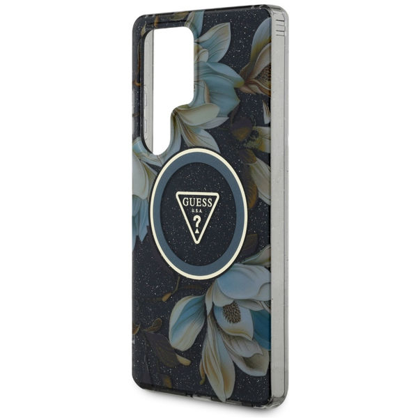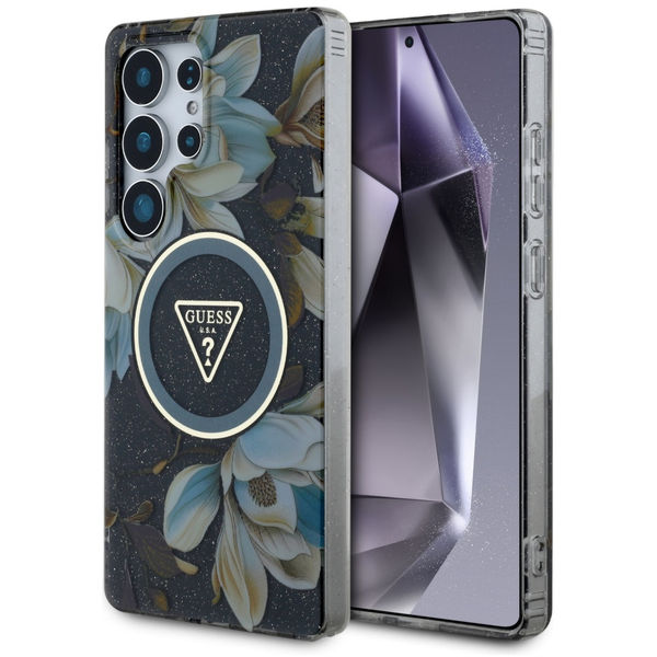Accesoriu Guess - IML Metal Glitter Flowers Triangle MagSafe (GUHMS25LHFLPEDK) - Samsung Galaxy S25 Ultra - Black pentru Samsung Galaxy S25 Ultra