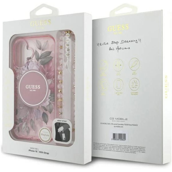Accesoriu Guess - IML Flowers with Pearl Strap MagSafe (GUHMP16MHFWBRCESP) - iPhone 16 Plus - Pink pentru Apple iPhone 16 Plus