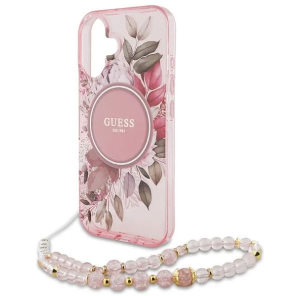 Accesoriu Guess - IML Flowers with Pearl Strap MagSafe (GUHMP16SHFWBRCESP) - iPhone 16 - Pink pentru Apple iPhone 16